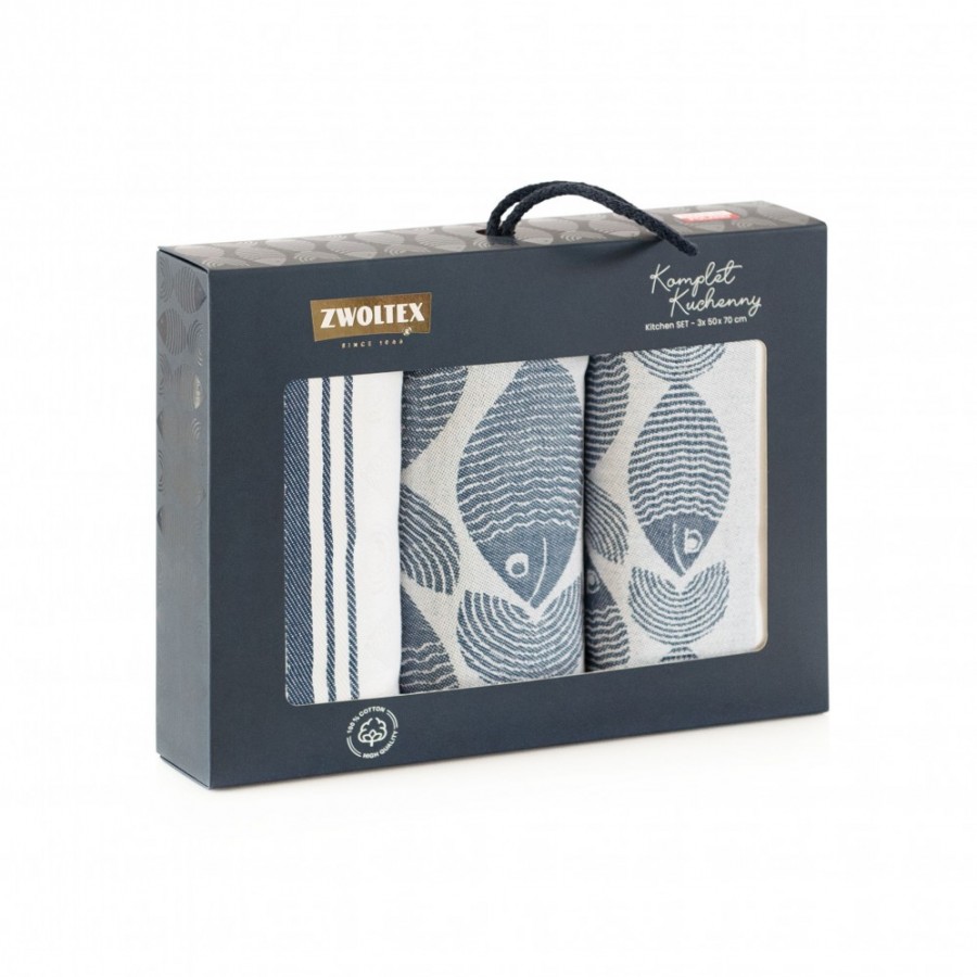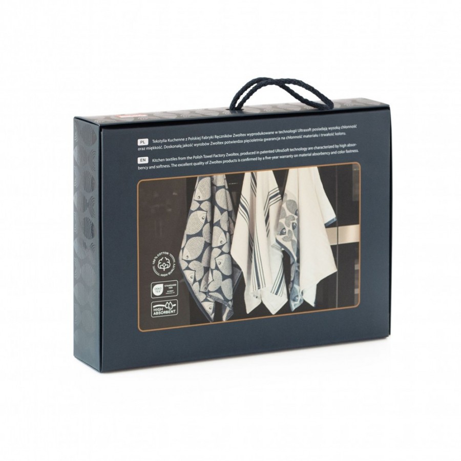 Ryby to tkana żakardowo, szybkoschnąca ściereczka z motywem ryb. Połączenie białego i granatowego koloru sprawia, że model bardzo efektownie prezentuje się w każdej aranżacji. Dzięki technologii Ultrasoft oraz bawełnie egipskiej produkt jest miękki i miły w dotyku, oraz znakomicie chłonie wodę. Ta nowoczesna ściereczka sprawi, że kuchenne porządki staną się dużo bardziej komfortowe. W zestawie 3 ściereczki o wymiarach 50x70 cm.