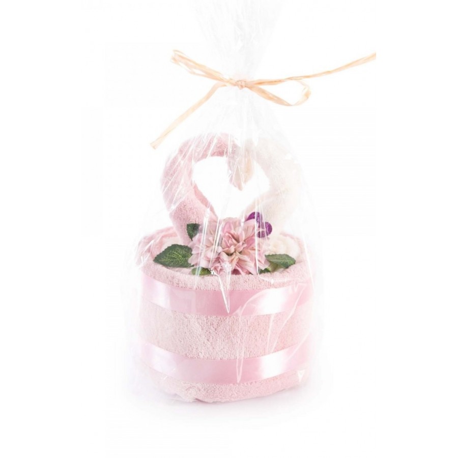 Piękny tort na którym jest umieszczone serduszko. Tort składa się z dwóch ręczników kąpielowych :
